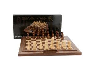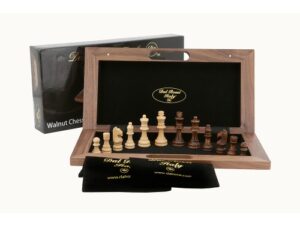 The set is housed in an elegant Walnut Finish Chess Box, measuring 16 inches in width. The rich, dark walnut finish lends a timeless and sophisticated look to the chess box, enhancing the overall aesthetic appeal. The box is not merely a storage solution; it’s a presentation piece that adds to the overall grandeur of the set.