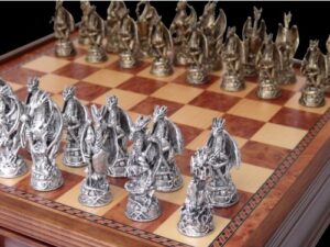 The chessmen themselves are a testament to the set’s attention to detail. Made from metal with a dark titanium and silver finish, these 85mm pieces exude a sense of luxury and sophistication. The contrast between the dark titanium and silver colors adds a captivating visual dimension to the game, making each move a visual delight.
